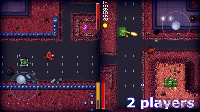 通过左侧的操纵杆控制坦克移动,右侧的操纵杆控制炮塔转动。屏幕左侧的像素槽用于自动检测。自动瞄准功能让玩家更容易锁定敌方坦克,从而简化瞄准过程。点击屏幕上的任意空白区域会立即调整炮塔方向。别忘了收集硬币和水晶,它们能帮助你快速提升金币。在双人模式下,设备屏幕被分为两半。玩家控制的坦克会自动射击敌人。如果你点击屏幕上的空白区域,坦克将会转向并开火。类似的能力也适用于第二名玩家控制的坦克2。